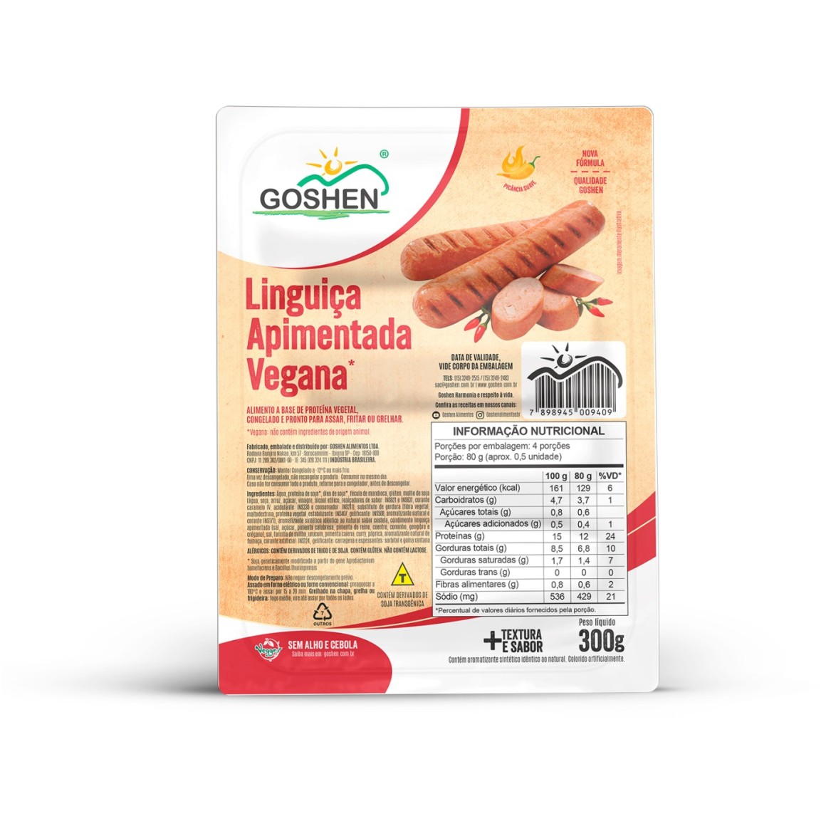 Linguiça Apimentada Vegana à base de Soja disponível em embalagem com 300g.